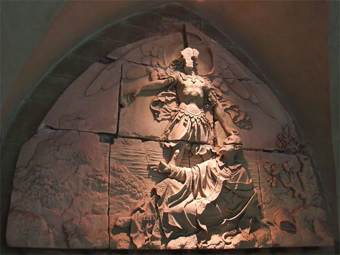 San Miguel Arcángel y Saint Aubert, ubicado en la Abadía de Mont Saint Michel, Manche, Normandía, Francia. Saint Aubert, obispo de Avranches en el siglo 8, vio en sueños el Arcángel Miguel, quien le ordenó construir un santuario en el Monte Tumba.
