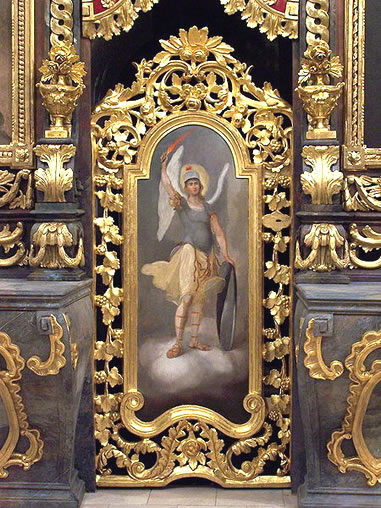 Arcángel San Miguel con su espada, la imagen es un icono católico griego de San Miguel Arcángel. Tiene una llameante espada en la mano. El icono fue pintado en el final del siglo 18, como parte del iconostasio de la Catedral Católica Griega de Hajdúdorog, Hungría.