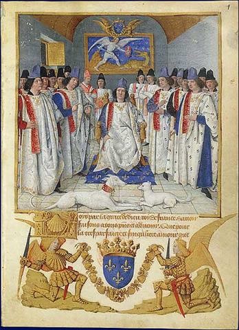 Luis XI preside el capítulo de Saint-Michel, la iluminación de Jean Fouquet, 1470 París, BnF, Departamento de Manuscritos, francés 19.819, fol. 1 Esta miniatura es una obras maestras conocidas de Fouquet. Orden de San Miguel.