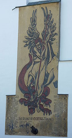 San Miguel Arcángel sometiendo con su lanza al dragón, ubicado en el Monumento a los Caídos de la Segunda Guerra Mundial en la pared exterior de la parroquia de Santa Gertrudis en Barweiler, Alemania.