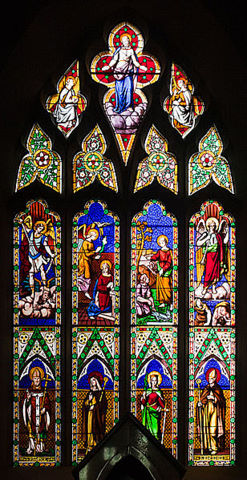 San Miguel Arcángel y la asunción, ventana del este, detrás del altar por Frederick Resolver Barff (1823-1886), que representa la Asunción (la luz de arriba), los arcángeles Miguel, Gabriel, Rafael, y un ángel tocando la trompeta (fila superior), y el Patrick santos, Bridget, Dympna, y Brendan (fila inferior), ubicado en la Iglesia de San Miguel, Ballinasloe, Condado de Galway, Irlanda.