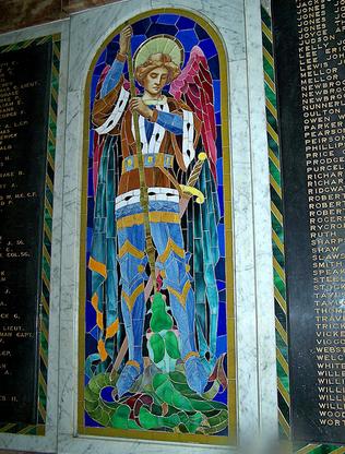 San Miguel Arcángel imponiéndose a la bestiaSan Miguel Arcángel imponiéndose a la bestia, ubicado en el monumento a los caídos de Shropshire, Whitchurch, Reino Unido.