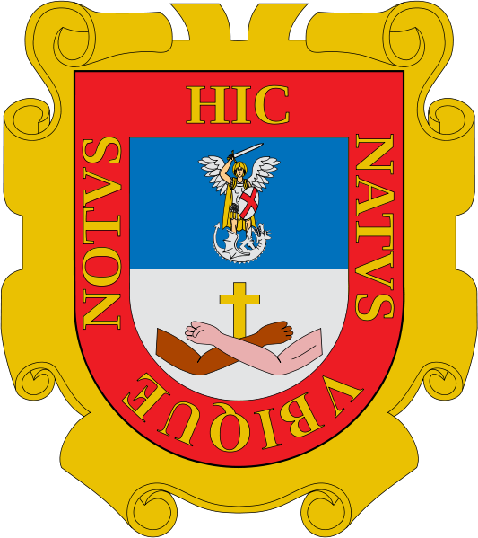 San Miguel Arcángel en el escudo de San Miguel Allende, En borde de gules, hay una inscripción latina “Hic Natus Ubique Notus”, que significa aquí nacido y en todo el orbe conocido. El centro del escudo tiene un cuartel dividido en dos; en el superior se encuentra el arcángel San Miguel (De él se toma el nombre del pueblo), luchando con un demonio. En el interior se encuentra el emblema franciscano en honor a fray Juan de San Miguel, fundador de la ciudad, el cual consta de un brazo franciscano y un indio, formando una X.