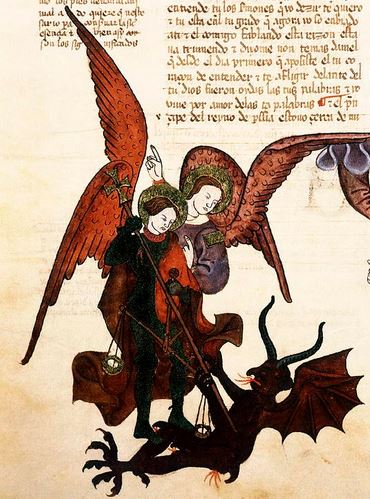 San Miguel Arcángel y Satanás. Iluminado miniatura manuscrito del siglo 15 de la Biblia de Alba. Satanás es aquí conocido como Samael. La Biblia de Alba, fue terminada en 1430, es una traducción del Antiguo Testamento del hebreo al castellano medieval.