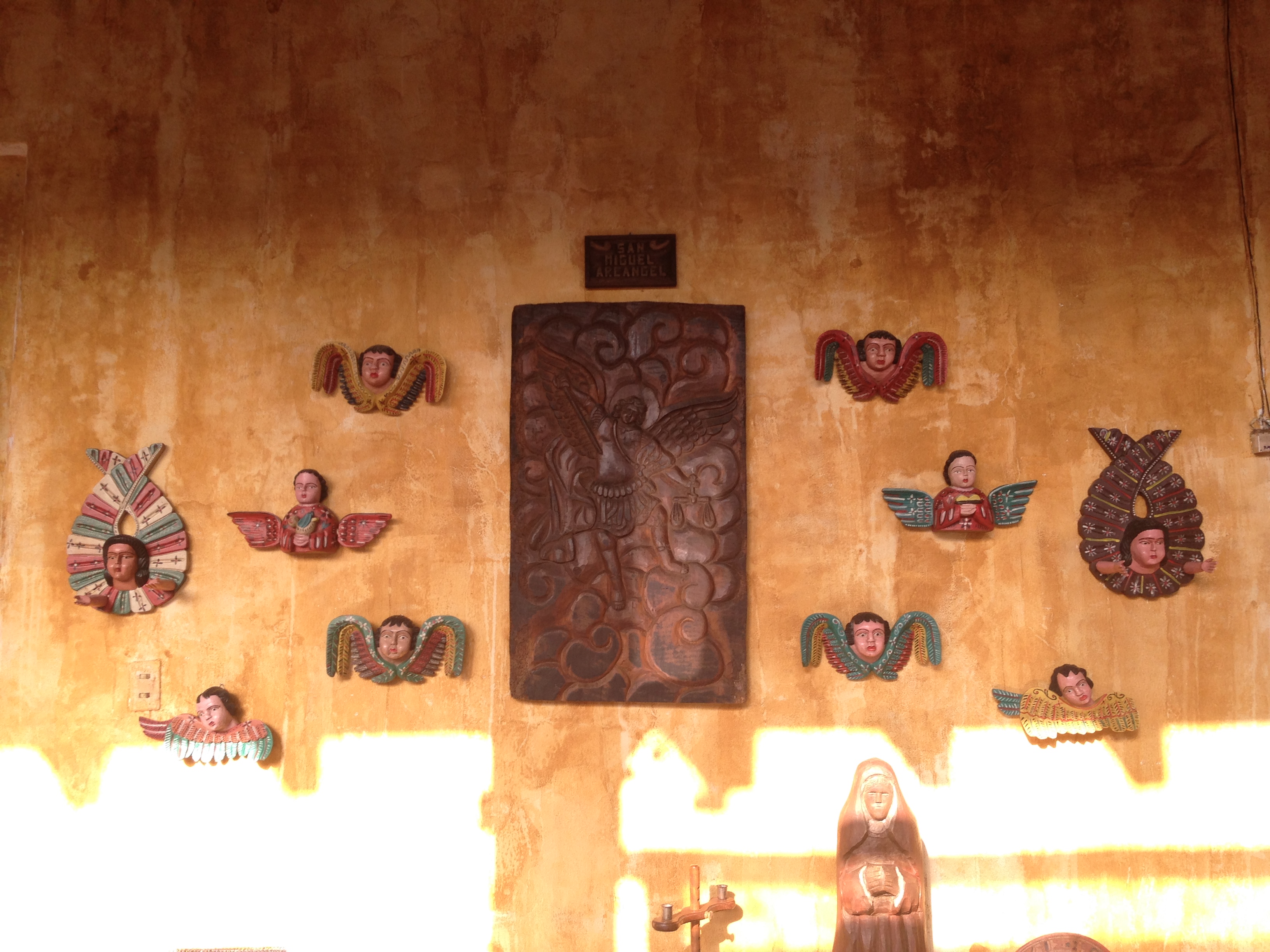 San Miguel y los Coros Celestiales, labrada en alto relieve, usando madera fina de Cedro, ubicado en la Antigua Guatemala, Centro America. Contribuido por Yaxum