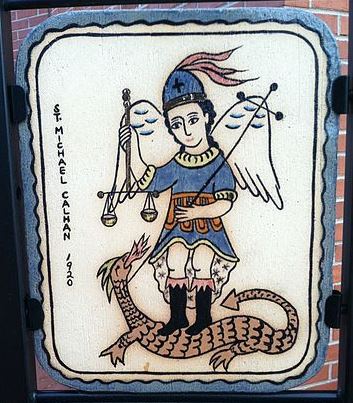 Miguel Arcángel pisando al dragón, pieza de arte del año 1920, ubicada en la Iglesia Católica de Santa María en Colorado Springs, Colorado, Estados Unidos.