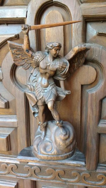 San Miguel Arcángel con su espada, ubicado en el Hotel Holiday Express, Guanajuato, Gto. México. Contribuido por Roberto Muñoz