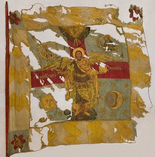 Arcángel Miguel rodeado por dos medallones con Jesús y María, ubicados en Bandera rusa, ganada en la Batalla de Narva el 20 de noviembre de 1700.