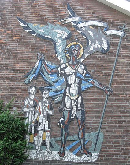Mosaico del arcángel Miguel custodiando a dos niños, hijos de Abram Stokhof de Jong en la pared de Sint Michaëlschool en Van Galenstraat en Kruiskamp, Amersfoort, Países Bajos.