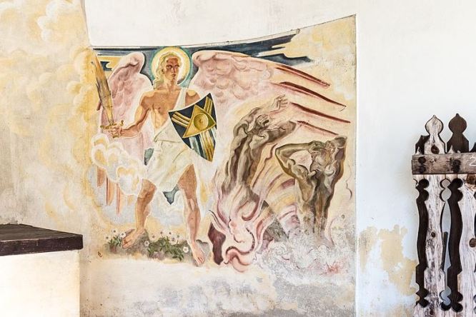 Fresco de San Miguel Arcángel, ubicado en la capilla del cementerio, municipio de Galicia, distrito de Voelkermarkt, Carinthia, Austria, EU.