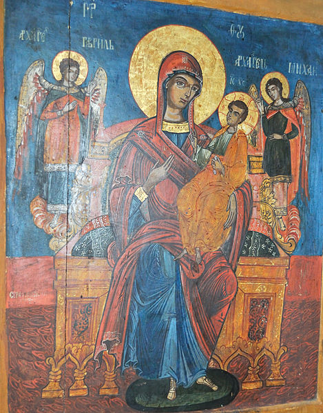 Representación de San Miguel Arcángel con la Virgen María y el niño Jesús en su regazo, en la iglesia de madera de San Nicolás ubicada en Bărbătești, en la aldea de Poeni, en el condado de Valcea en Rumania.