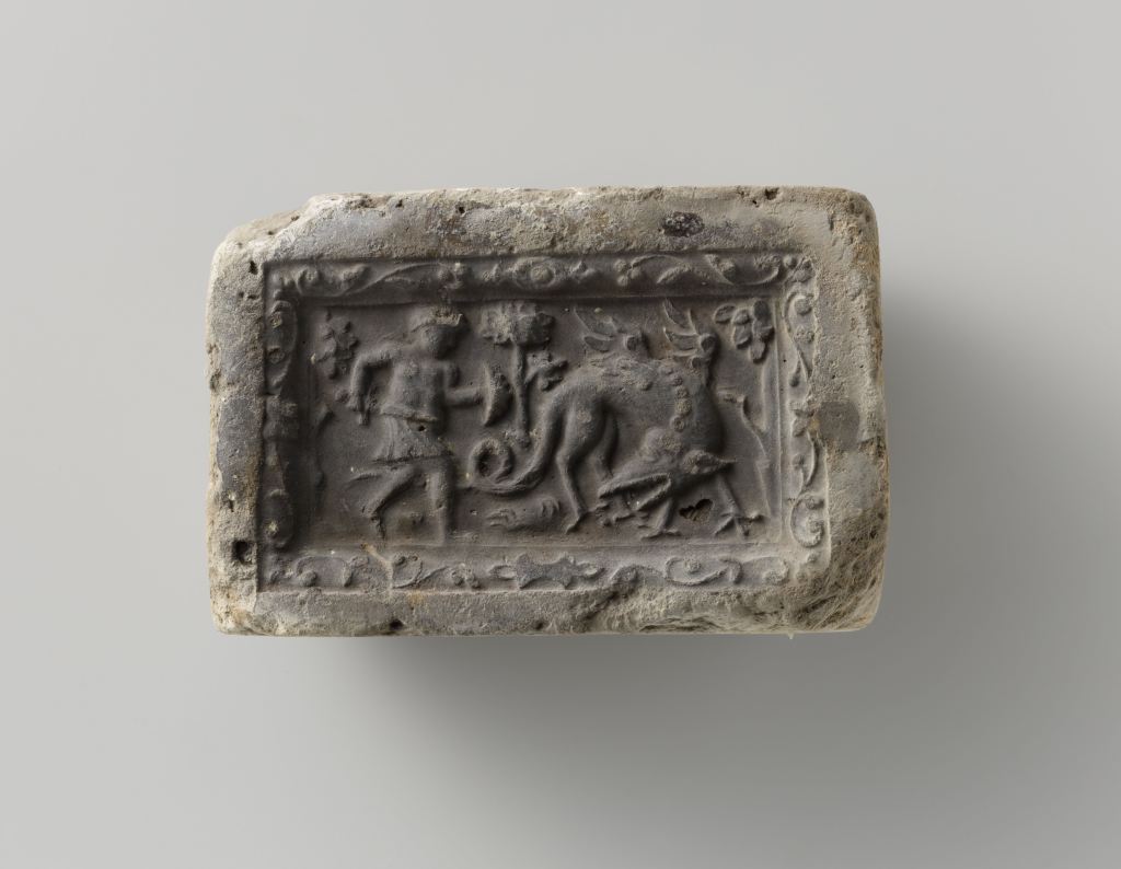 Representación de San Miguel Arcángel combatiendo con su escudo y espada al dragón. El material de la piedra es hecho de tierra fina cocida con el borde decorado, fabricada en los países bajos del sur.