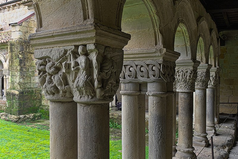 Capitel románico con el motivo de la lucha de San Miguel Arcángel con el diablo y el pesado de las almas, Ubicado en la galería septentrional del claustro de la Collegiata, en la localidad de Santillana del Mar, en España.