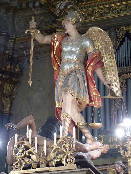 Representación de San Miguel Arcángel en madera sometiendo al demonio, ubicada en el interior de la basílica de San Miguel, en el ábside principal que alberga el coro o santuario, en Mentón, Francia.