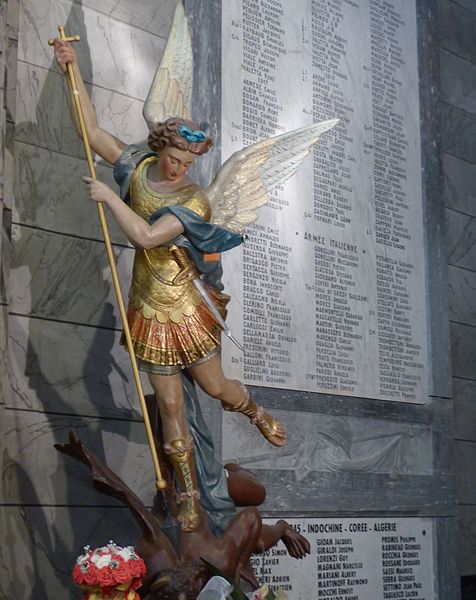 Escultura en madera tallada policromada y dorada de San Miguel Arcángel derrotando a satanás, en el interior de la capilla de las almas del purgatorio, ubicada en la basílica de San Miguel en Menton, en los Alpes-Maritimes, Francia.