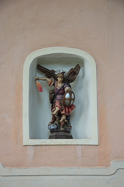 Representación de San Miguel Arcángel pisando la cabeza de satanás ubicada en la iglesia católica de San Miguel en Orth en el Danubio, en la localidad del distrito de Gänserndorf, en el estado de Baja Austria.