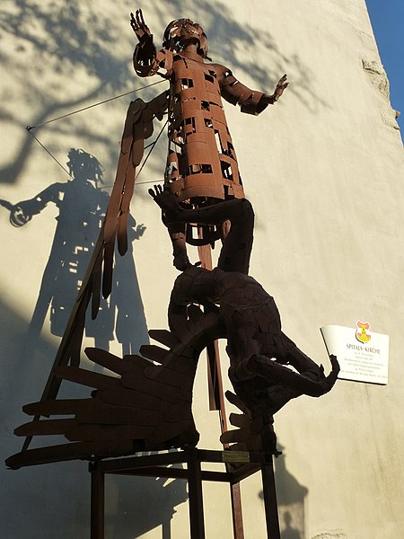 Escultura de San Miguel Arcángel denominada por el Prof. Robert Colnago «Angel Fall» sometiendo a satanás, ubicada en el hospital iglesia de la Santísima Trinidad, antiguo hospital público y antiguo recinto del cementerio en Austria.