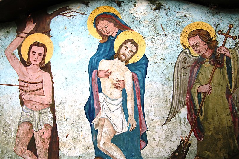 Mural de San Miguel Arcángel luchando contra el dragón en el monte calvario, a un costado de la Virgen María sosteniendo en sus brazos a su hijo Jesucristo muerto, ubicada en la localidad de Haigermoos en la Alta Austria.
