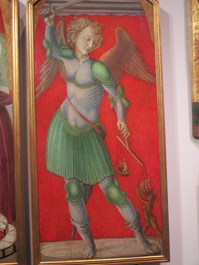 Pintura de San Miguel Arcángel sosteniendo la balaza de la justicia que pesa las almas
