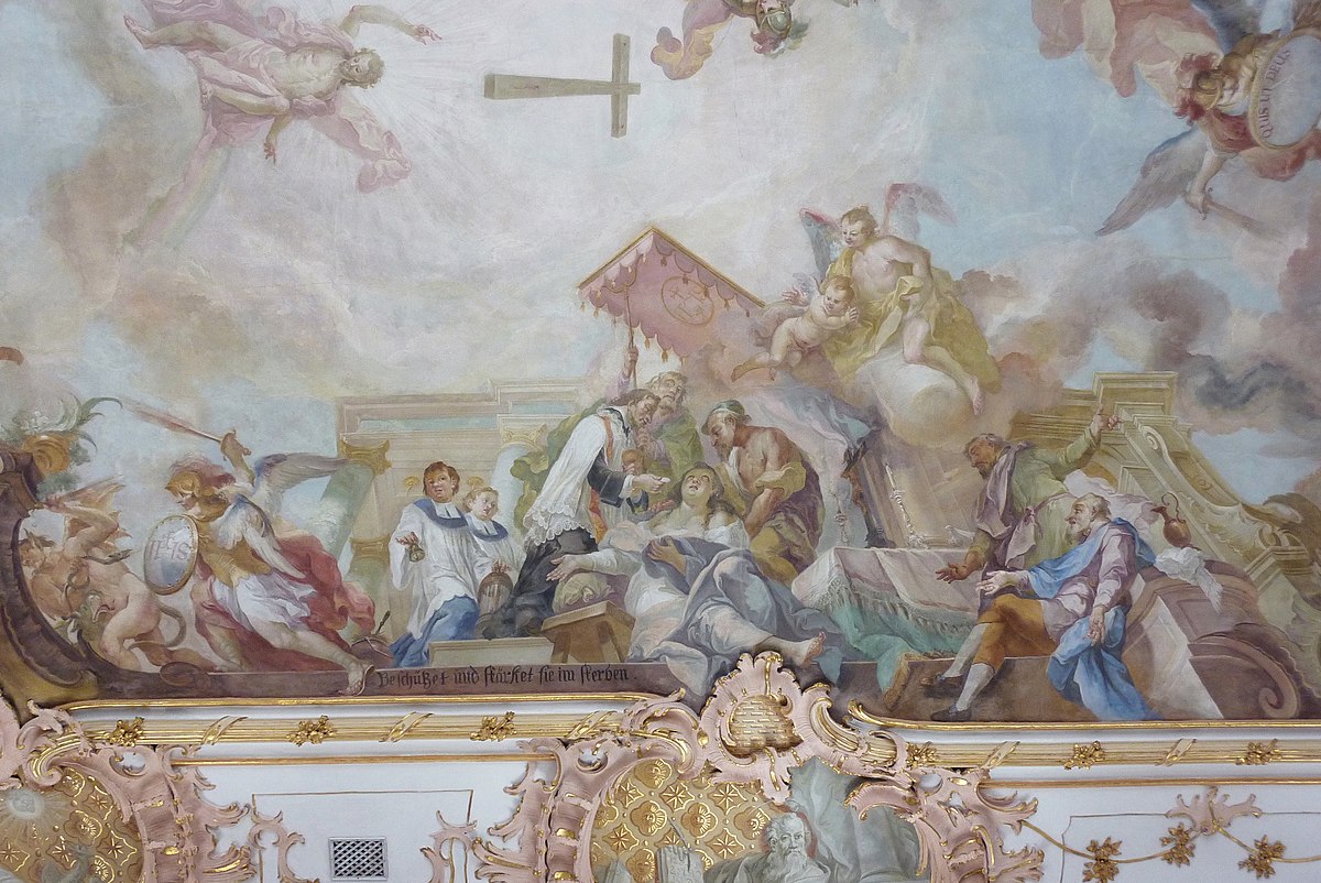 Fresco de San Miguel arcángel expulsando los demonios, un cura gastado en la última comunión de una mujer moribunda; tiene una inscripción: protégelos y fortalécelos mientras mueren ubicado en el techo de la nave (parte sur), de la iglesia parroquial católica de San Miguel en Lutzingen, municipio del distrito de Dillingen an der Donau en Alemania.