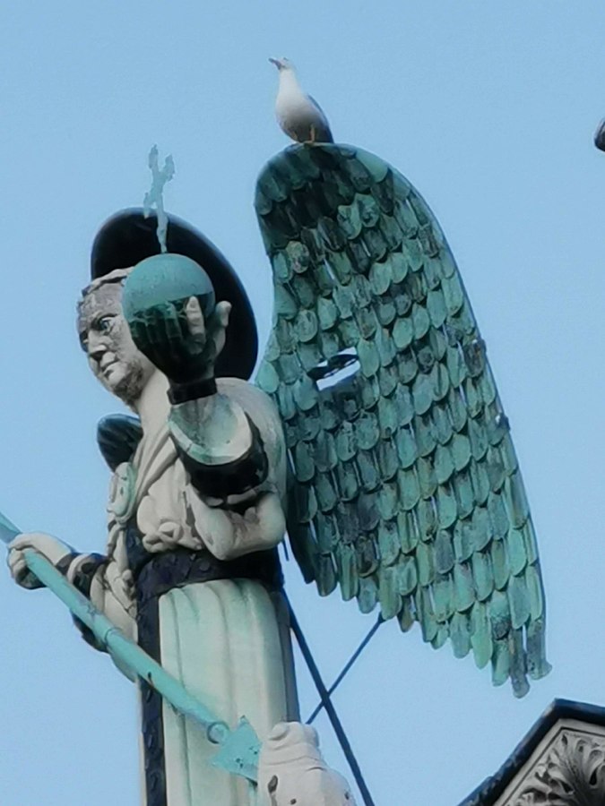 Representación de San Miguel Arcángel luchando con su espada contra el dragón ubicada en el primer plano de la fachada de la basílica del mismo nombre, en el centro de Lucca en Italia.