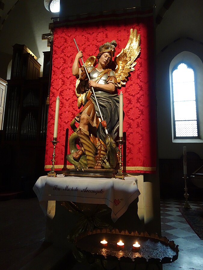 Escultura de San Miguen Arcángel derrotando con su lanza al maligno enemigo, ubicada al interior de la iglesia de Santa María die Servi, en la ciudad de Vicenza en la región de Veneto, Italia.