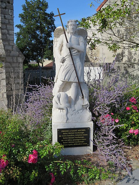 Escultura de San Miguel Arcángel derrotando al dragón, en la parte inferior de la escultura tiene impresa la oración de » San Miguel Arcángel con tu luz, ilumínanos, con tu espada, defiéndenos, San Miguel Arcángel con tus alas protégenos; ubicada en la población de Bonnières-sur-Seine en Francia.