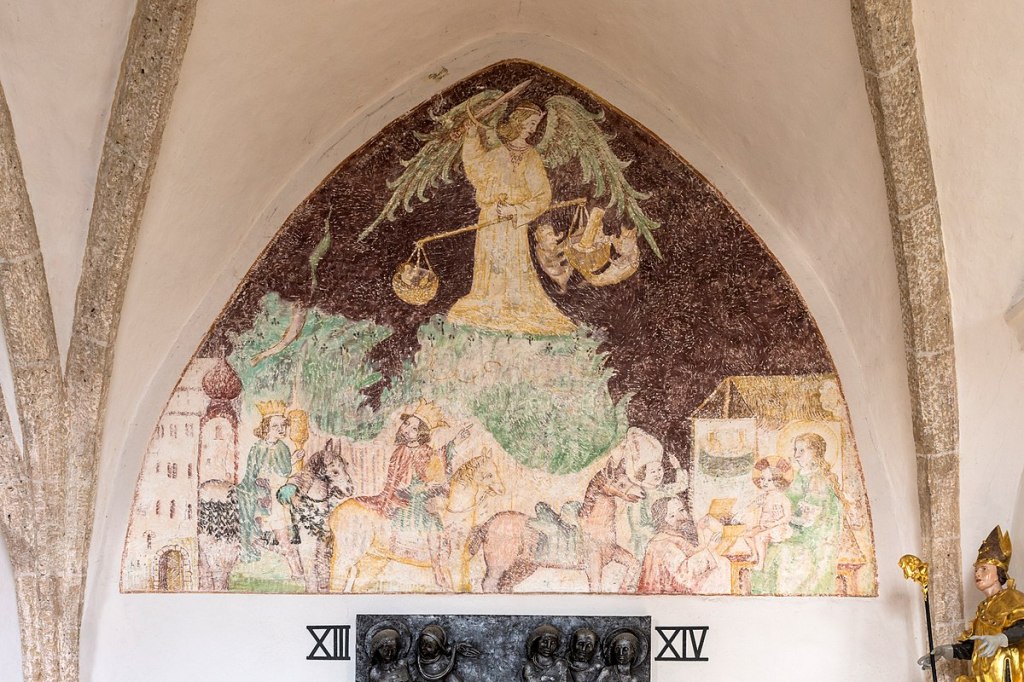 19 noviembre 202317 agosto 2023 Editorial Fresco de San Miguel Arcángel pesando las almas Fresco de San Miguel Arcángel pesando las almas, ubicado a la izquierda de la nave gótica de la iglesia del Calvario de San Filipo y Jakobi, de estilo barroco a principios del siglo XVIII en Austria. Compartir: Comparte en Facebook (Se abre en una ventana nueva) Facebook Compartir en X (Se abre en una ventana nueva) X Enviar un enlace a un amigo por correo electrónico (Se abre en una ventana nueva) Correo electrónico Imprimir (Se abre en una ventana nueva) Imprimir Me gusta Cargando... Relacionado