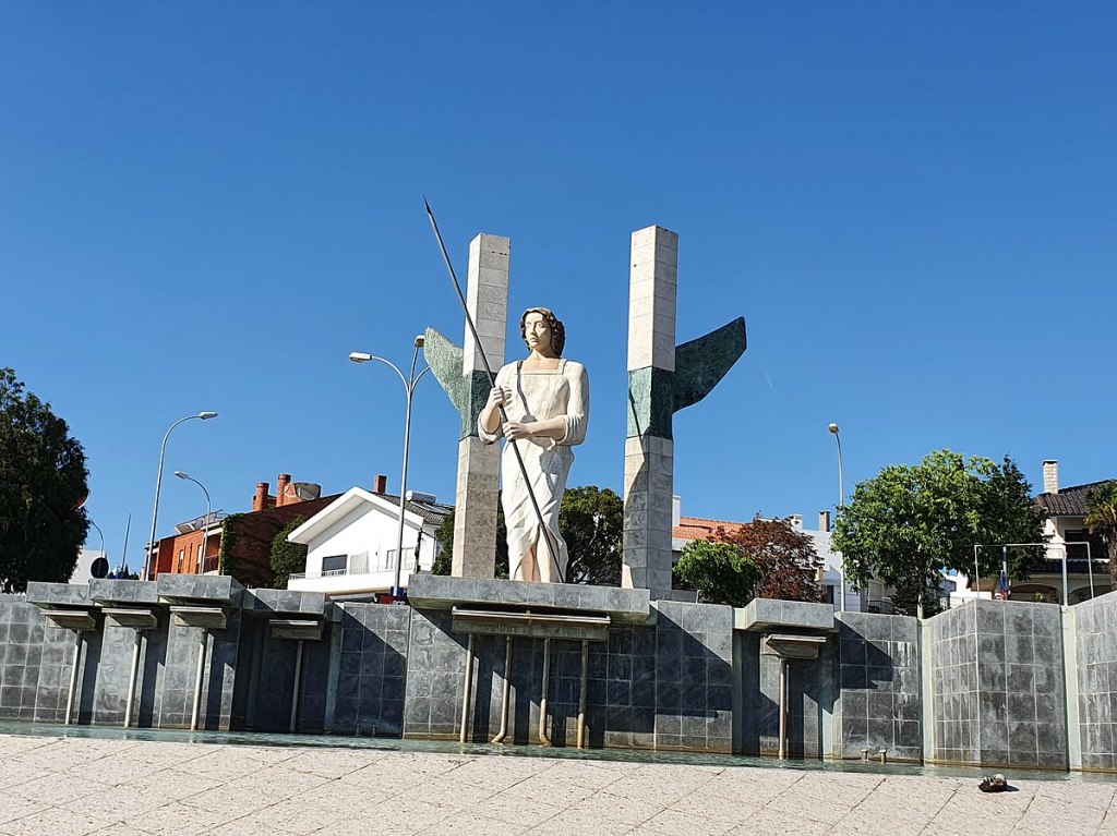 Escultura de San Miguel Arcángel luchando contra el dragón del año 2011 creado por Francisco Simões, integrado en una fuente de luz ubicada en la glorieta de Queijas, por encargo del Ayuntamiento de Oeiras en Portugal.