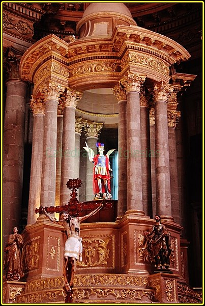 Representación iconográfica de San Miguel arcángel ubicada al interior del templo y exconvento de San Miguel Arcángel perteneciente al conjunto de edificaciones del tipo fortaleza levantadas por los agustinos en el siglo XVI. Localizado en la ciudad de Ixmiquilpan, Hidalgo,México. Pertenece al conjunto de edificaciones del tipo fortaleza levantadas por los agustinos en el siglo XVI.