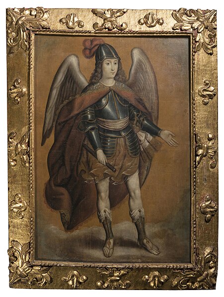 Pintura de San Miguel Arcángel del año 1660, del autor Baltasar Vargas Figueroa titulada guerrero celestial, protector de las almas, ubicada al interior de la iglesia de Santa Clara en Bogotá, Colombia.